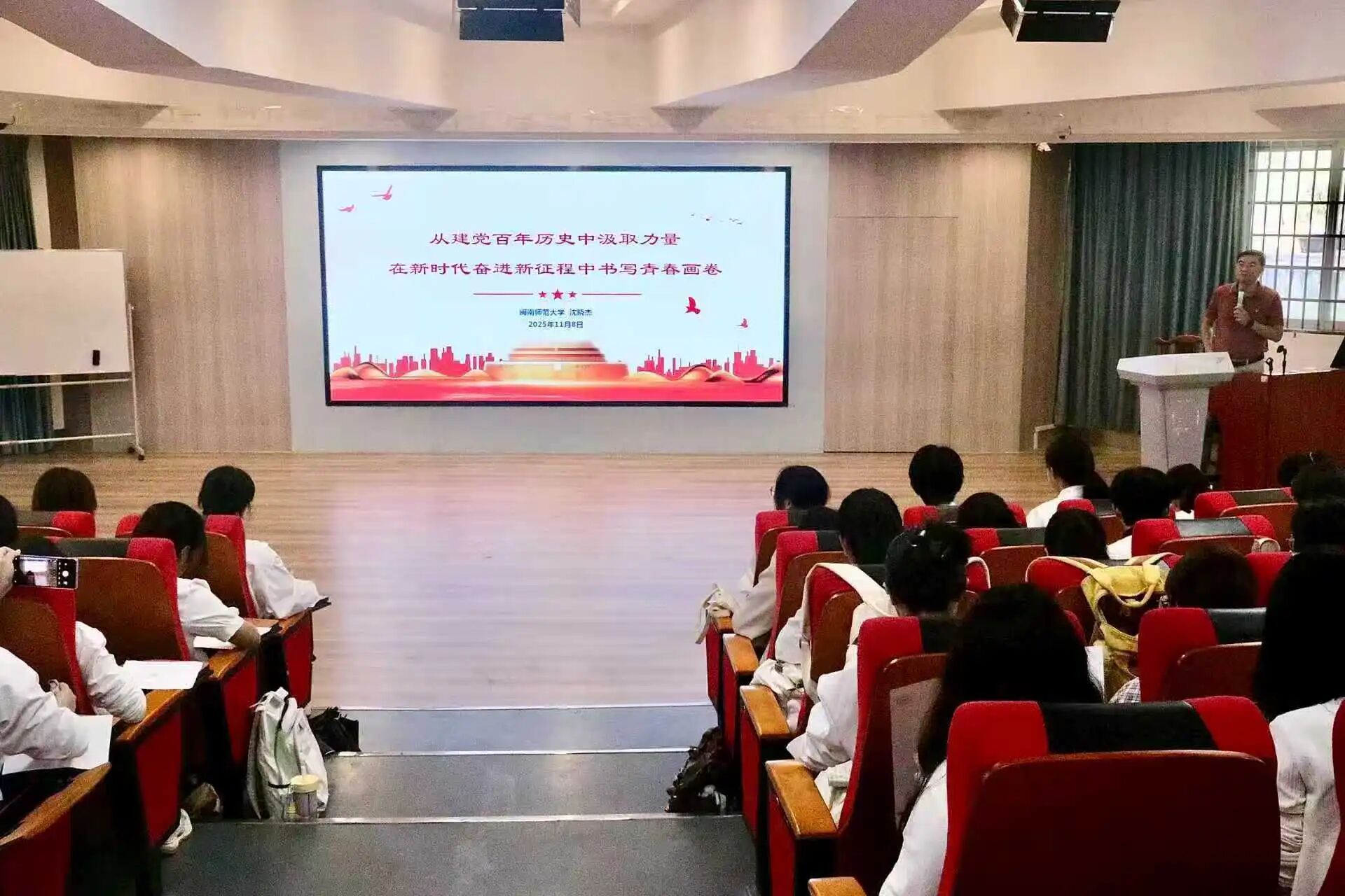 开班仪式后,沈晓杰以《从建党百年历史中汲取力量,在新时代奋进新征程中书写青春画卷》为题,为本次培训班学员讲授了第一堂党课。
