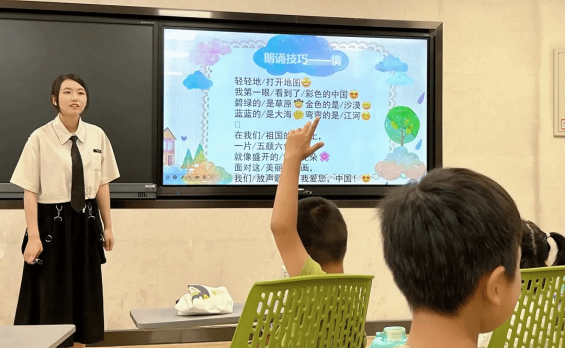 随后,志愿者围绕朗诵的几个小技巧带大家深入体验朗诵的奥妙。在共鸣训练以及停顿实践中,小朋友们初次感受到气息和节奏的奇妙;在古音异读的生动解析中,引导小朋友体会声韵的魅力;在结合实例学习朗诵技巧中,小朋友们理解如何运用声音让文本更有层次和表现力;最后志愿者指出感情是朗诵的灵魂,在《彩色的中国》中加入活泼的表情,让小朋友们全情投入。活动尾声,志愿者带领小朋友们一起回顾了朗诵要点,并在古诗《江上渔者》的诵读中巩固了所学。