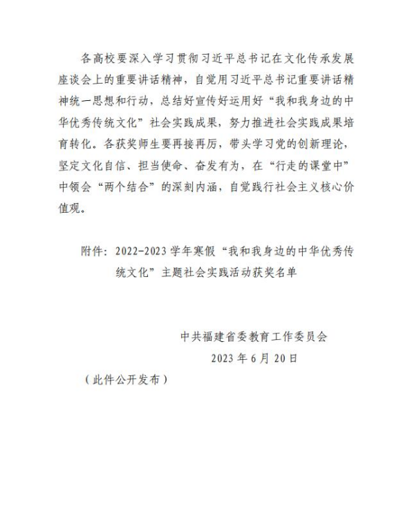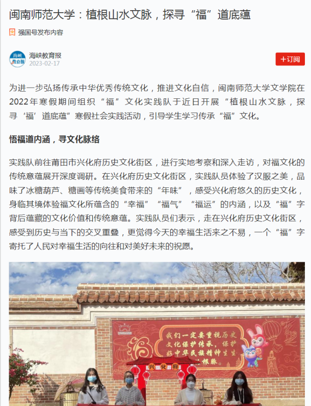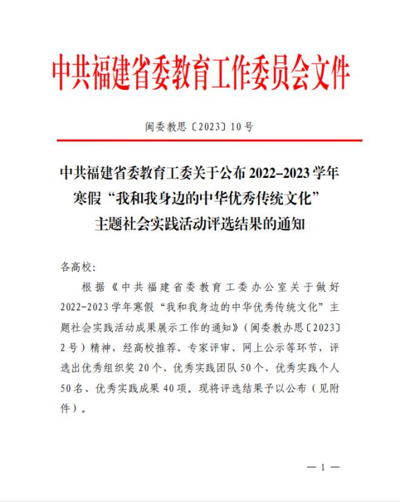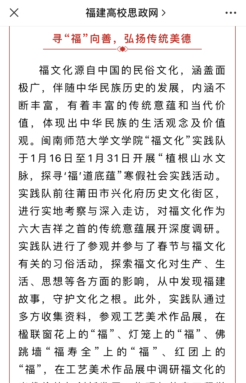 “福”文化实践队,在经过层层推荐、专家评审、网上公示等程序后,荣膺福建省2022-2023学年寒假“我和我身边的中华优秀传统文化”优秀实践团队。